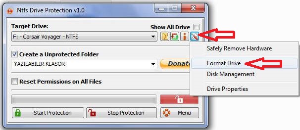 Şimdi programı çalıştırıp Start Protection dediğimizde flash belleğimiz yazmaya karşı korumalı oluyor. Ve virüs filan bulaş(a)mıyor.