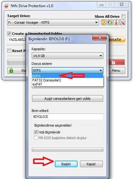 3) Flash belleğimizi yedekledikten sonra flash belleğimizin dosya sistemini programı kullanarak (Aşağıdaki resimdeki gibi) FAT 32 den NTFS'ye çeviriyoruz.